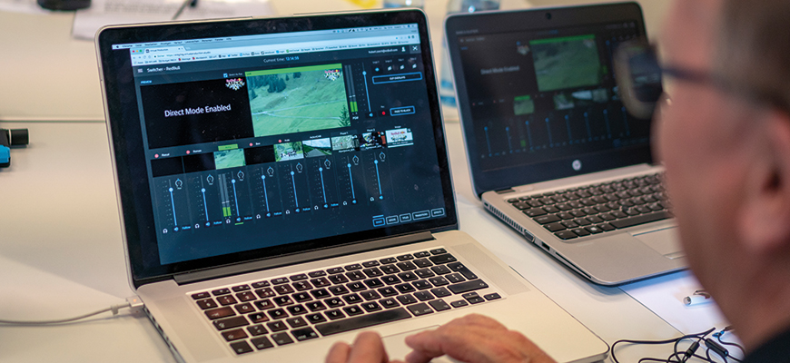 Using wireless Wi-Fi or 4G dongle transmitters on up to six cameras, footage is fed to a virtual production switcher that is hosted in the cloud via Amazon Web Services. A remote operator then logs on via a laptop and switches between camera angles, or adds logos and graphics. It’s like a full outside broadcast live TV unit with just camcorders and a laptop.