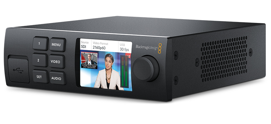 The Blackmagic Web Presenter includes 12G-SDI and HDMI 2.0 inputs with support for all formats up to 2K/60p. There’s also an SDI output so you can record a full-resolution master for editing afterwards. You also get balanced XLR audio inputs for connecting professional microphones, along with RCA hi-fi inputs for connecting iPhones and other audio sources.