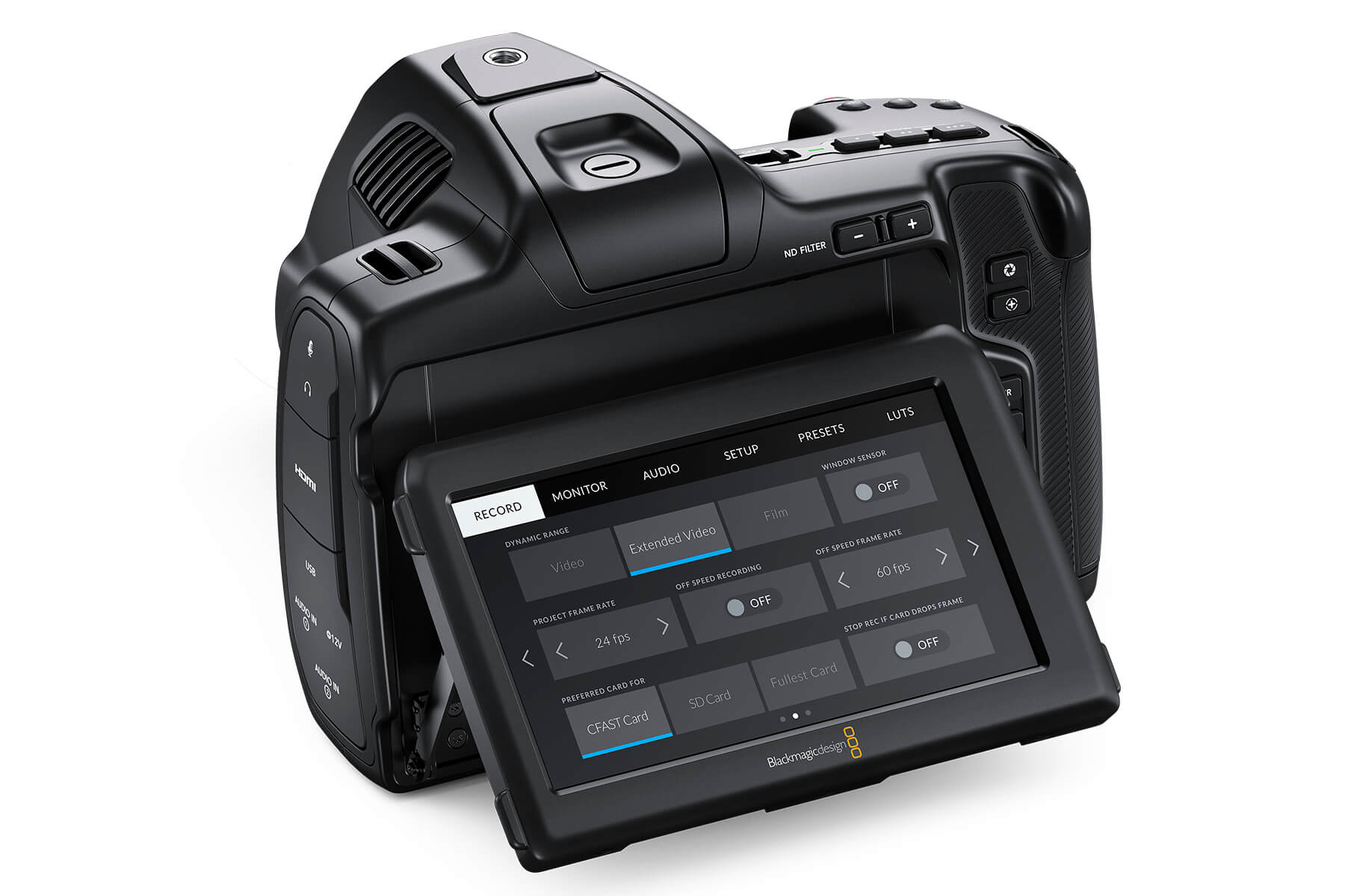 One stand-out feature is a 5in tilting touchscreen LCD, with 1500nit brightness for HDR monitoring directly on camera. The addition of internal 2-, 4- and 6-stop ND filters also opens the camera up as a more realistic option within high-end professional workflows.
