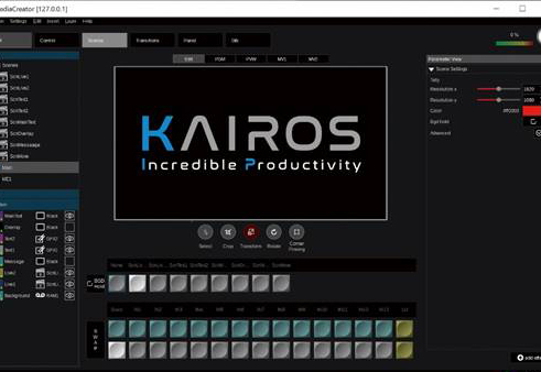 Kairos offers a customisable graphical user interface that enables users to manage unlimited layers and effects with ease. The platform sets a new standard of usability and customisation with “Photoshop-style” intuitive live compositing interface. Since video mix processing are GUI-based, the platform does not limit the number of MEs or keys, like a traditional switcher. Keys, effects and scaling are set within each scene without restriction and the total number video layers are only dependent upon the GPU capacity.