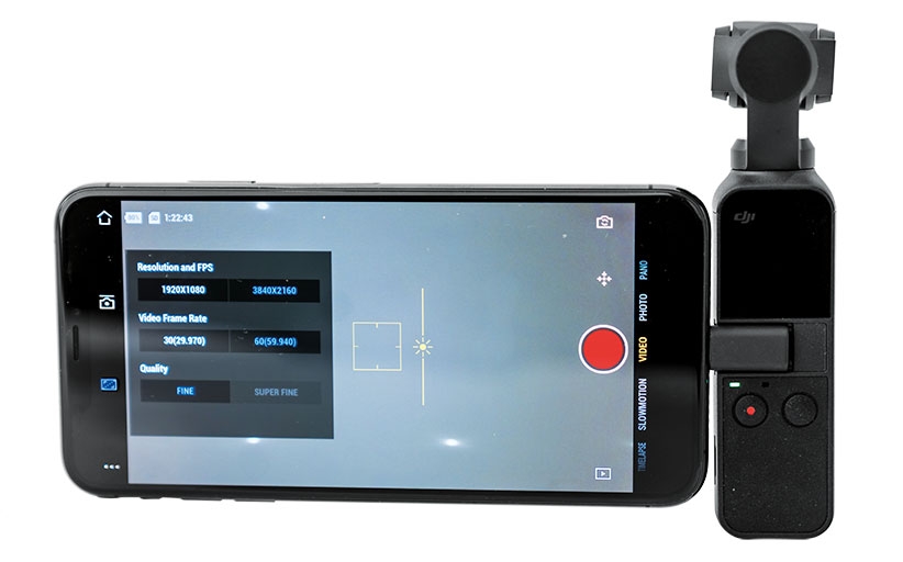 Controlling the Osmo is simplicity itself, as it only has two buttons. One is the on/off button, which also allows you to toggle through settings. The other is the Rec On button or shutter release, if you are shooting stills.